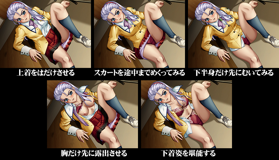 この様に、プレイヤーの好みのままに、様々に服を剥いでいく事が可能になります。