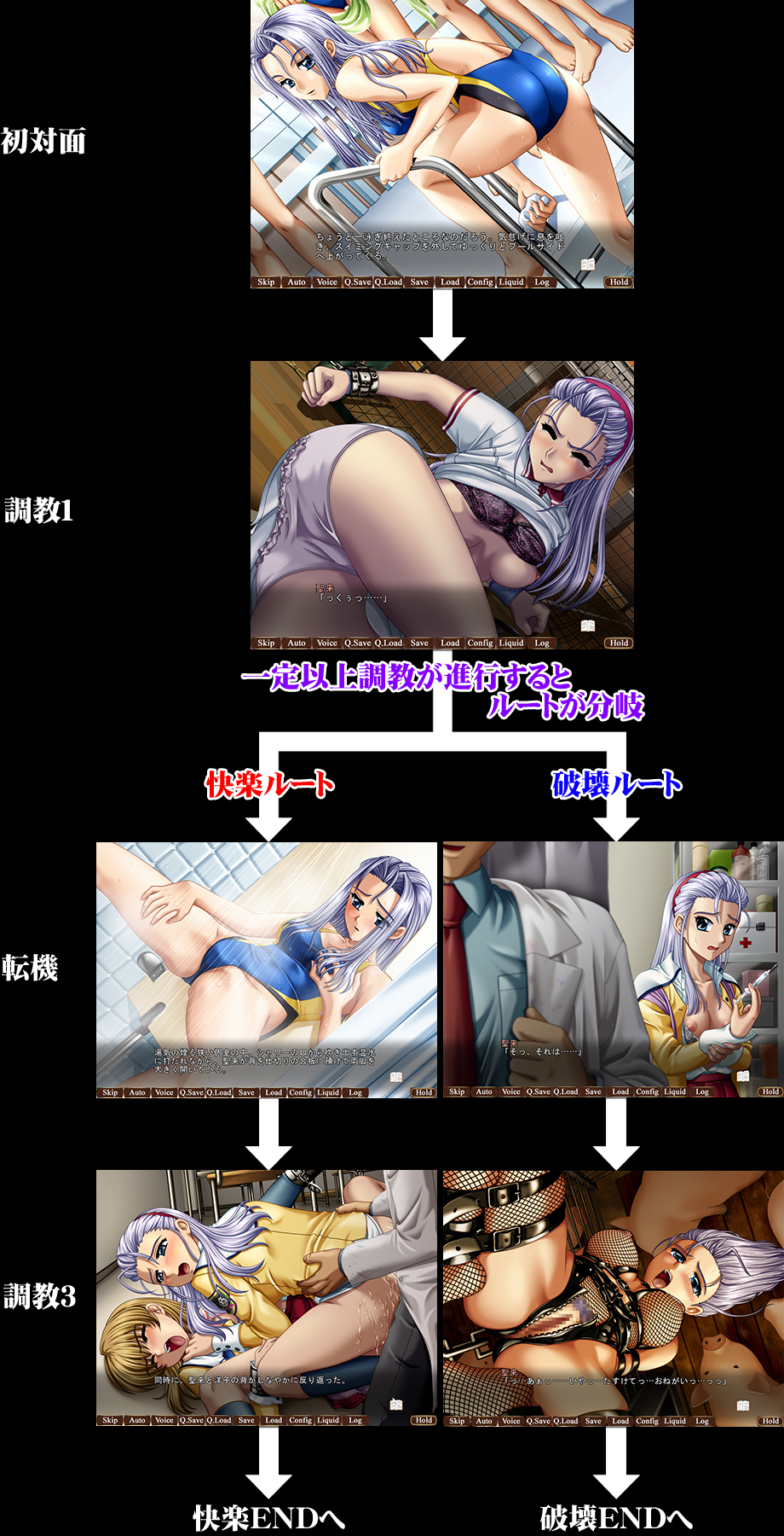 ■ルートの分岐 ![]() 「快楽ルート」「破壊ルート」どちらの方向に調教が進んでいるかで、同じ段階のイベントでも内容、CGが全く異なります。 |